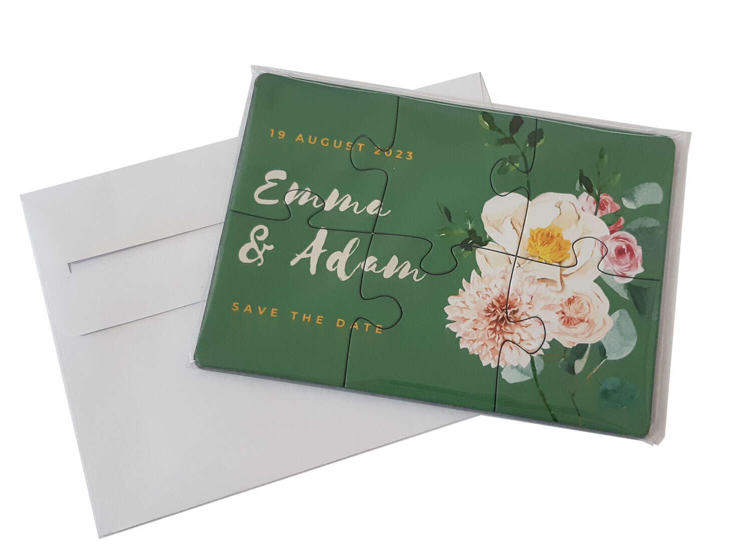 Our puzzle cards are a perfect way to share messages, invitations or announcements. Our puzzle cards come in packs of eight, six or 40. Think outside of the box when you are planning your next event and deliver your message in puzzle card format. Your guests will be intrigued by their special invite which will make the upcoming event even more special! These flat-packed puzzles consist of six pieces that are set on cardboard backing and then shrink wrapped. An elegant envelope is provided for each puzzle set for easy mailing.